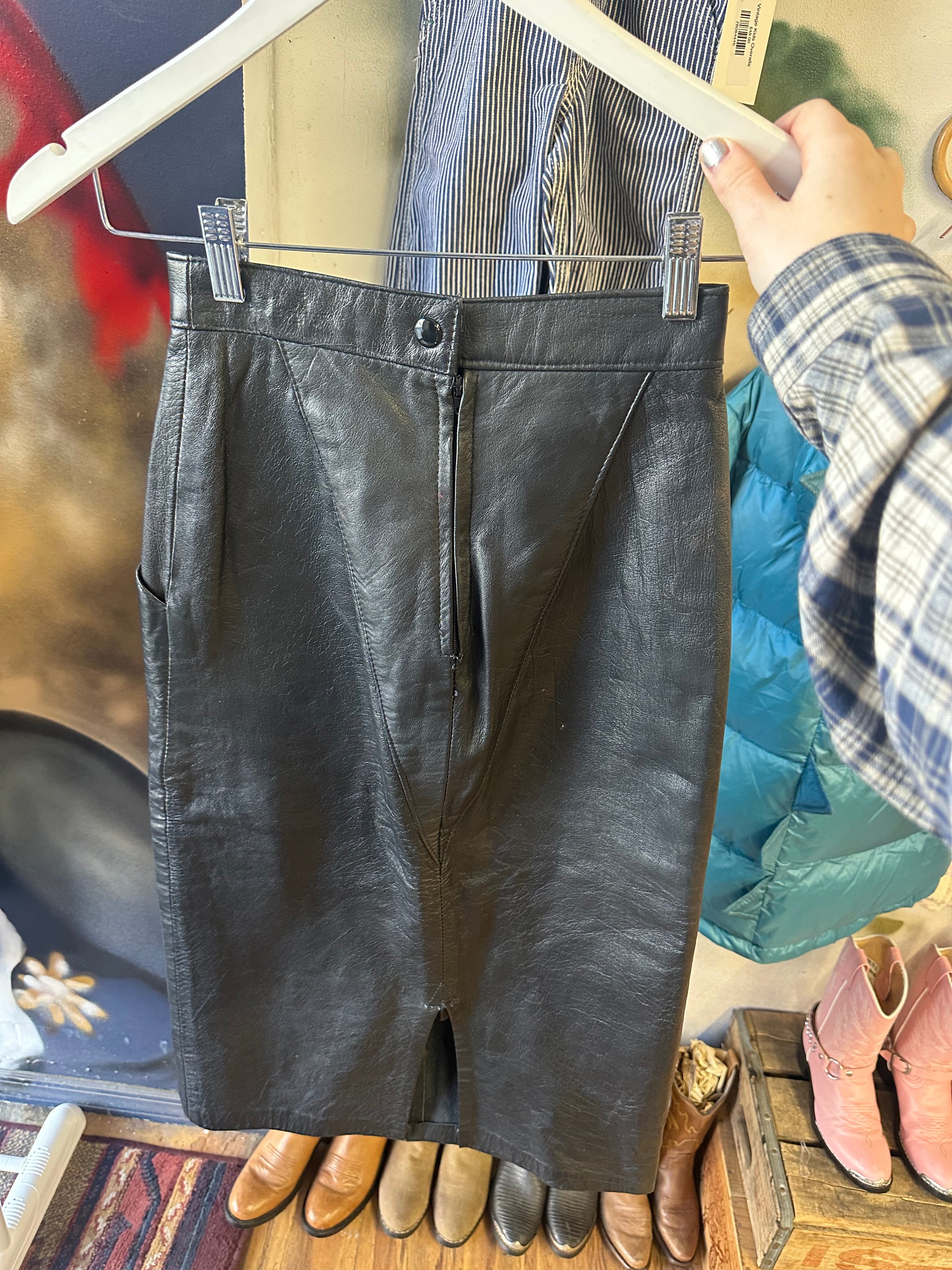 Black leather mid length skirt